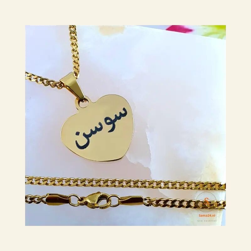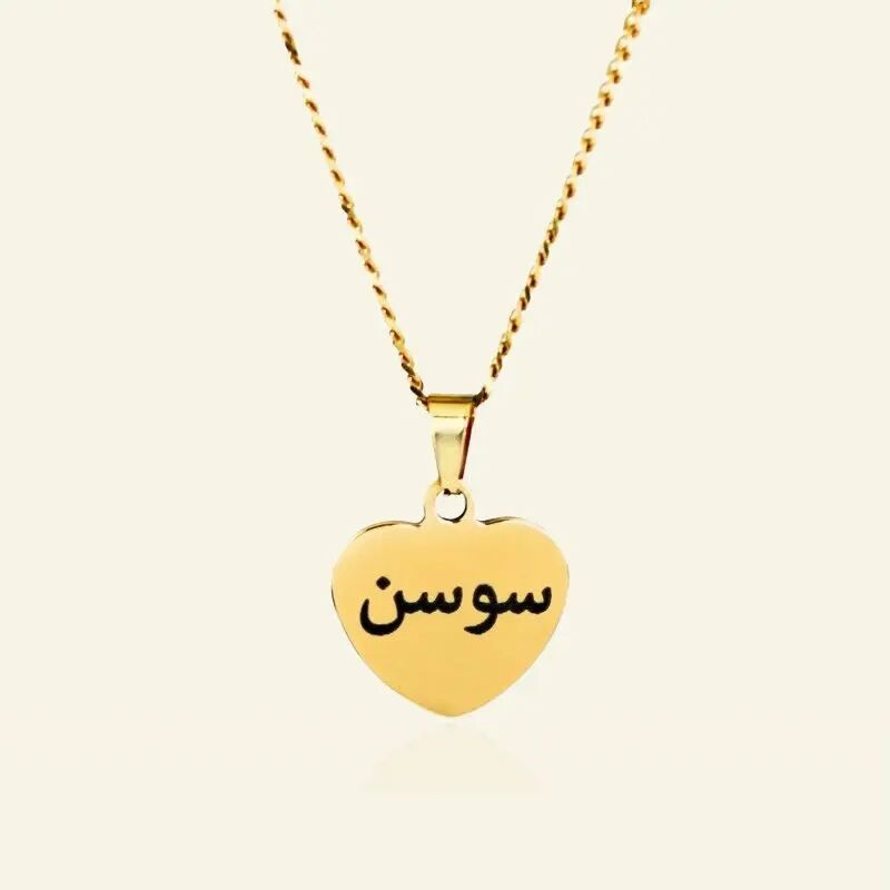 Ce collier prénom arabe avec pendentif en forme de cœur est en titane et peut être commandé en couleur or.