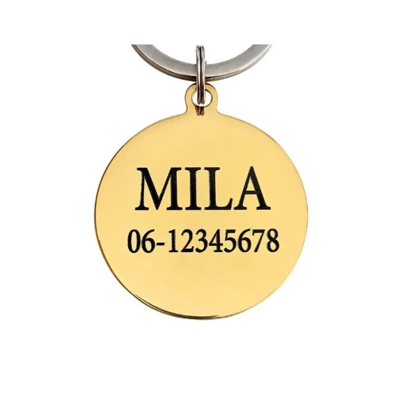 Tous nos prix pour commander une médaille pour chien incluent la TVA. Et l’expédition aux Pays-Bas et en Belgique est gratuite. Si vous comptez acheter cette gravure de plaque d’identité de luxe, une bague sera incluse. Pour pouvoir l’accrocher immédiatement au collier de votre chien.