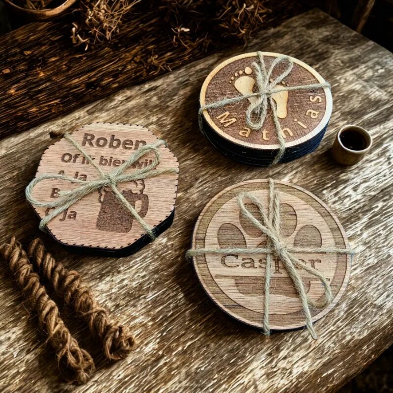 Nos sous-verres sont fabriqués en bois, ce qui assure une protection durable de vos meubles. Grâce à la précision de notre technique de gravure, votre design reste beau, même après une utilisation fréquente.