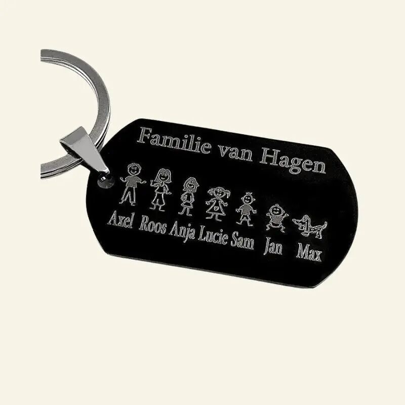 Graveren sleutelhanger met poppetjes, namen en datum ( tekst familienaam )