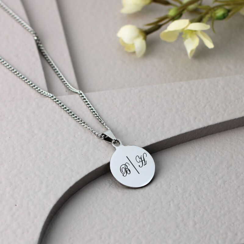 Deze zilveren ketting met 2 initialen, de eerste letters van je naam graveren, in de zilver kleurig met titanium hanger is super leuk. Omdat je hiermee je vriend kan verrassen of vriendin of je familie met deze prachtige zilveren ketting met ronde hanger met letter van titanium. Laat daarom deze mooie ronde hanger van titanium in de kleur zilver met 2 intialen naam graveren voor jezelf of je geliefde.