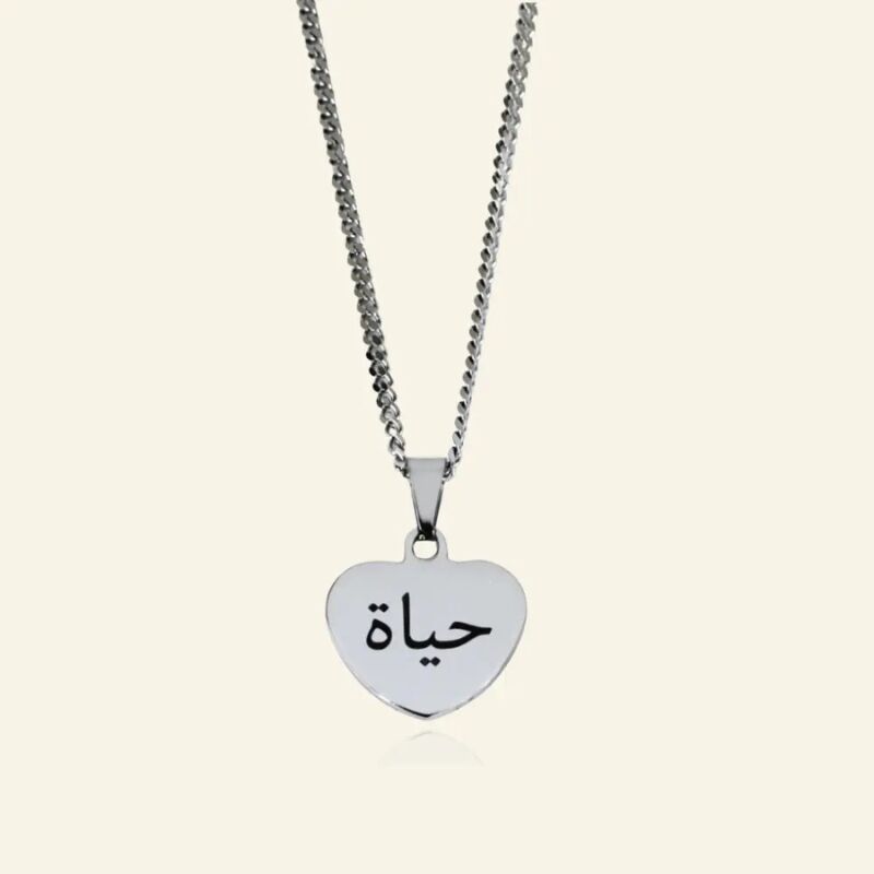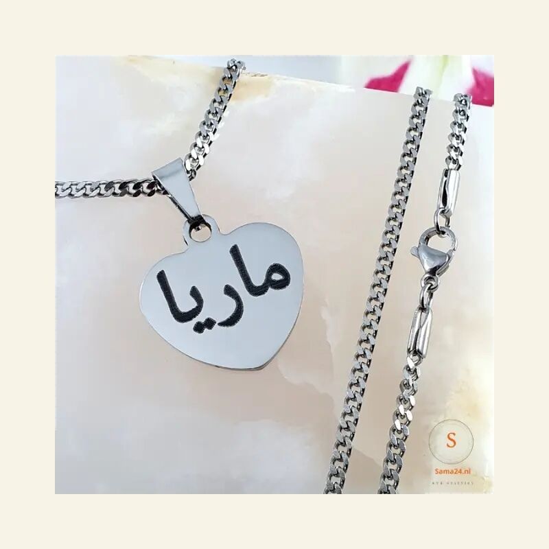 Verras je vriend, vriendin of je familie met deze prachtige zilver kleurige naamketting Arabisch met hartje van titanium. Laat daarom deze hanger met Arabische naamketting graveren met een naam in Arabisch. Deze ketting Arabisch is een super leuk cadeau. En deze ketting Arabische naam kan je aan 2 kanten laten graveren.