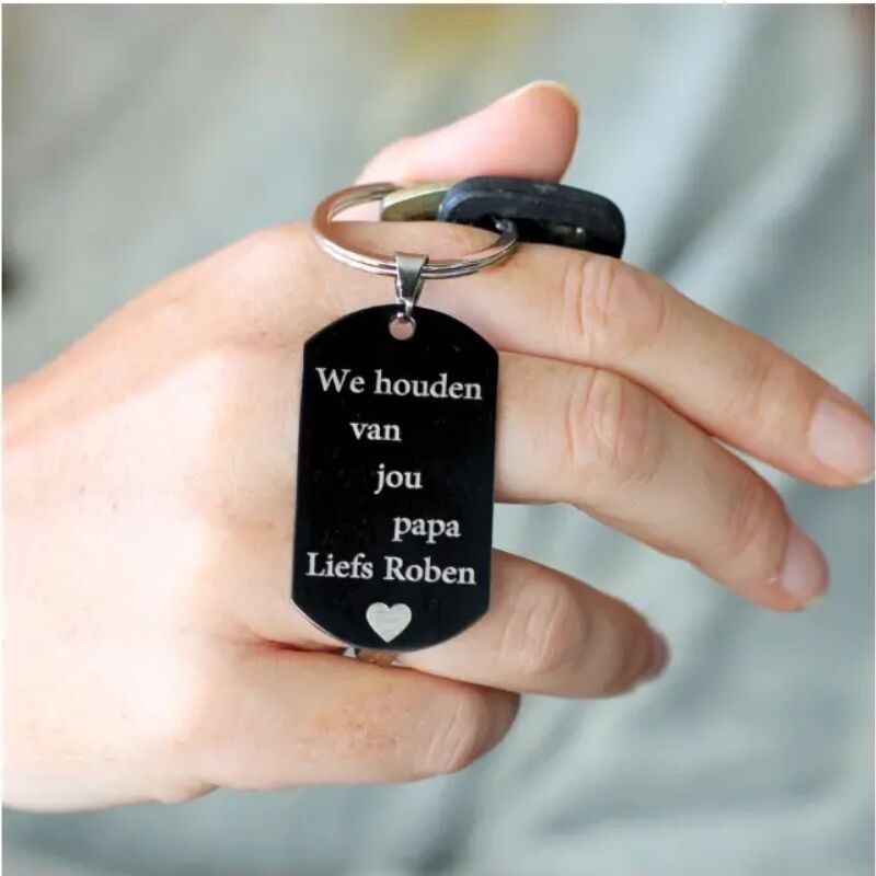 Wat een leuk cadeau een sleutelhanger vader, laat je eigen tekst laten graveren als zoon of dochter. Kies een mooie tekst en laat deze vast leggen op 1 van onze mooie sleutelhangers. Je kan de sleutelhanger voor vader op 2 kanten laten graveren, bijvoorbeeld een mooie tekst op de voorkant en een bijzondere datum op de achterkant.